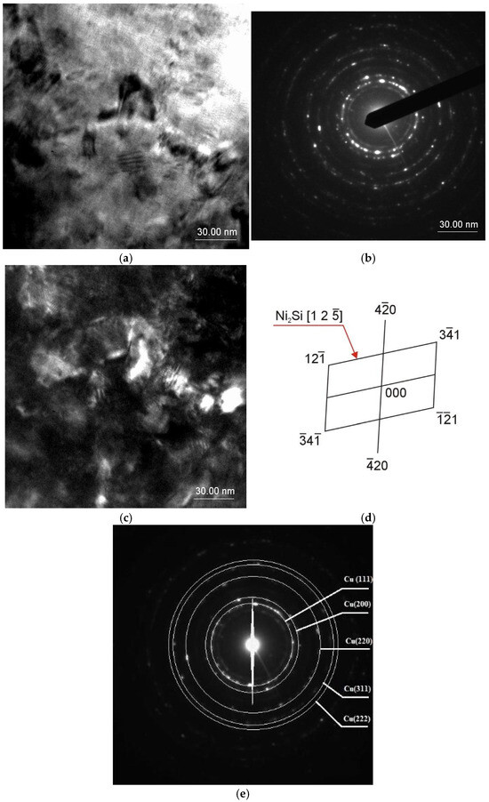 The use of cold rolling with 50% work hardening after solution annealing had a significant impact on the alloy structure. Since the precipitation of secondary particles occurs in privileged places, which include grain boundaries or crystal lattice defects (vacancies, dislocations), cold plastic deformation caused an increase in the number of secondary particle nucleation sites [33]. In the case of the CuNi2Si alloy, the secondary particles responsible for alloy strengthening are the Ni2Si phase [5]. In the CuNi2Si alloy, which was not plastically deformed to cold but only heat treated (solution annealing and aging), there are fewer privileged places for the precipitation of the secondary phase; therefore, after the precipitation of the Ni2Si phase during aging at 600 °C, a very rapid growth of the precipitated particles occurred after 10 min (Figure 1). The zone axis of the determined Ni2Si phase is set as [2 4 −1] with a quite optimal quality factor of 0.35. Based on the electron diffraction pattern, it can be stated that the phase is not coherent with the Cu matrix, because of a lack of planes on the diffraction pattern that are parallel–coherent—or even semi-coherent to the determined intermetallic phase [22]. This crystallographic relationship causes an additional strengthening factor of enhancement of the mechanical properties based on the creation of internal stress of the first type—between very small areas ranging around the interplanar distance of the crystallographic cells (Figure 1d).