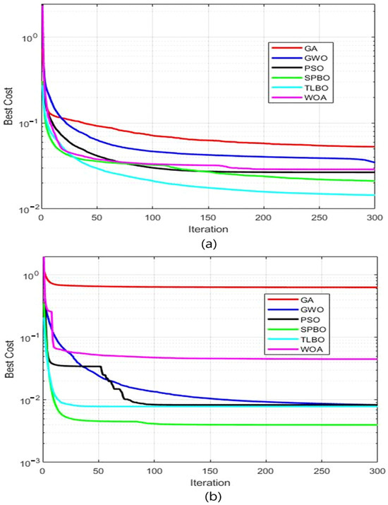 Comparison of the best cost values of different metaheuristics by iterations. (a) Undeformed process and (b) deformed process.