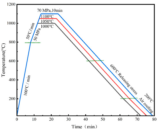 The powder mixture was placed into a graphite mold with a 40 mm diameter. This mold was then positioned in a fast hot-pressing sintering furnace and subjected to sintering under a vacuum pressure of 10−2 bar. The sintering was conducted at temperatures of 1000, 1050, and 1100 °C for the Ni-17Mo alloy bulk and at 1100 °C for the 0.5 vol.% RGO/Ni-17Mo alloy composites. Note that this specific Gr concentration was not determined through optimization in this study but was selected based on extensive research indicating its effectiveness in enhancing material properties [35,37,38]. Its adoption aimed to assess the reliability of the proposed fabrication process. During the holding stage, a pressure of 70 MPa was applied for 10 min, with a heating rate of 100 °C/min and a cooling time of approximately 40 min. The final sintered sample had a diameter of 40 mm and a thickness of approximately 6 mm. Detailed information on the rates of pressurization, heating, and cooling throughout the sintering process is provided in Figure 2.