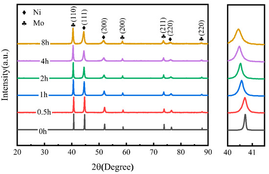 Figure 3 presents the XRD spectrum of Ni-17Mo alloy powder, with milling times ranging from 0 to 8 h. Both the intensity and width of the diffraction peaks decrease and broaden with increasing milling duration. This trend suggests a reduction in the average grain size, accompanied by a rise in lattice distortion and crystal defects. A similar pattern has been reported in previous studies [39]. In addition, milling durations ranging from 0.5 to 8 h did not result in mechanical alloying of the elemental Ni and Mo powders.