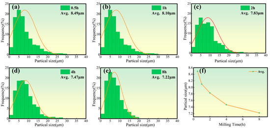 Particle size distribution curves (a–e) and their average sizes (f) for Ni-17Mo alloy powders milled over different durations ranging from 0.5 to 8 h, highlighting the effect of milling time on particle refinement and uniformity.