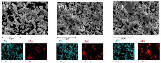 High-magnification SEM images of Ni-17Mo alloy powders milled for 0.5 h (a), 1 h (b), and 2 h (c), along with corresponding EDS elemental maps that illustrate the elemental distribution and microstructural features.