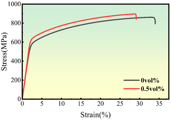 Figure 10 presents the room temperature tensile stress–strain curve of RGO/Ni-17Mo composite sintered bodies with varying RGO contents tested at a tensile rate of 10−3 mm/s. The sintered Ni-17Mo alloy exhibits a yield strength of 579.5 MPa, a tensile strength of 859.6 MPa, and an elongation at break of 31.6%. With the addition of 0.5 vol.% RGO, the yield and tensile strengths of the composite sintered body increase to 635.9 MPa and 894.3 MPa, respectively, although the elongation at break decreases to 26.4%. This enhancement in strength is attributed to the formation of Mo-rich carbides in the 0.5 vol% RGO/Ni-17Mo alloy composite. As seen in Figure 11, the introduction of RGO not only increases the irregular black contrast structures associated with cavities but also results in an increase in white regions. According to the literature [47], these white areas correspond to Mo-rich carbides. Owing to molybdenum’s strong affinity for carbon, the addition of RGO promotes carbide formation. Furthermore, RGO tends to agglomerate and stack, which increases the sample’s porosity and hinders matrix densification [48]. Consequently, while carbides enhance the composite’s strength and hardness, their presence also induces stress concentrations during tensile deformation, leading to premature fracture and reduced plasticity.