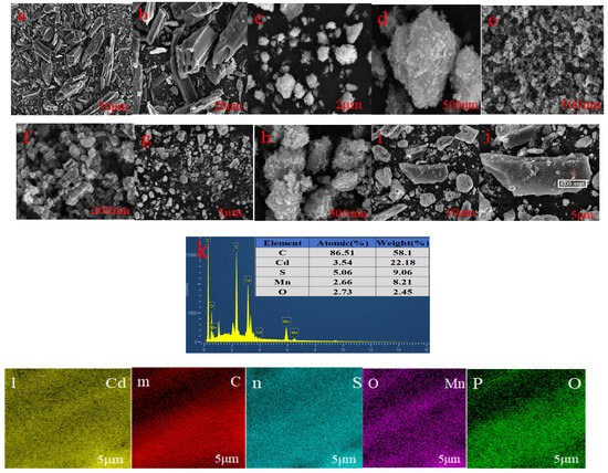 Figure 1 shows the SEM images of biochar (a,b), CdS (c,d), MnS (e,f), C@Cd0.6Mn0.4S (g,h), and C@Cd0.6Mn0.4S (i,j), as well as the EDS images (k–p) of C@Cd0.6Mn0.4S (mass ratio of C:Cd0.6Mn0.4S = 1:2). Figure 1a,b indicate that biochar (C) has a fractured or intact columnar pore structure (the enlarged pores are clearly visible), which can load Cd0.6Mn0.4S. Figure 1c–f shows that CdS and MnS are aggregated from multiple spherical nanoparticles. As presented in Figure 1g,h, the as-prepared composite material C@Cd0.6Mn0.4S presents irregular nanoparticles and uneven distribution under different magnification levels, and these nanoparticles aggregate with each other, with an average particle size of less than 200 nm. As shown in Figure 1i,j, C@Cd0.6Mn0.4S nanoparticles grow closely on the surface of C, and the C surface, originally relatively smooth, becomes rough and the aggregation phenomenon of C@Cd0.6Mn0.4S weakens, which means that C@Cd0.6Mn0.4S can provide more active sites. As for the ratio of four elements of C, Cd, S, and Mn, Figure 1k shows that the atom percentage is 86.51%, 3.54%, 5.06%, and 2.66%, and weight percentage is 58.1%, 22.18%, 9.06%, and 8.21%, respectively. The atom ratio of Cd/Mn/S is about 0.70:0.53:1, not 0.6:0.4:1, which resulted for the following reasons: SEM–EDS testing is a powerful material surface analysis technique that can obtain information and chemical composition on the surface of a sample. However, the quantification of the chemical composition via SEM–EDS is a semi-quantitative method and is not accurate enough. In addition, O is originated from biochar. Figure 1l–p show that the elements of Cd, C, S, Mn, and O are uniformly distributed on the surface of the composite material, which also more fully demonstrates the growth and dispersion of Cd0.6Mn0.4S nanoparticles on the surface of C.