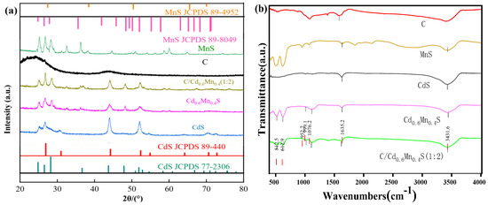 XRD patterns (a) and FTIR spectra (b) of C, CdS, MnS, Cd0.6Mn0.4S, and C@ C@Cd0.6Mn0.4S.