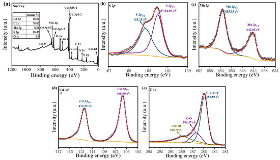 The composition and elemental valence state of the C@Cd0.6Mn0.4S solid solution was investigated by XPS. Figure 3a, the survey XPS spectra of the C@Cd0.6Mn0.4S solid solution, shows that the C@Cd0.6Mn0.4S is mainly composed of elements: Cd, Mn, S, C, and O; their atomic percentages are 10.01%, 8.61%,10.45%, 70.03%, and 0.9%, respectively. Among them, O is originated from biochar (the treated biomass gasification carbon residue). The results of element composition and content were almost consistent with those of SEM–EDS. Narrow-spectrum scanning of these elements was conducted to determine their valence states. As presented in Figure 3b, the S 2p spectrum can be divided into peaks at the binding energies of 163.25 and 162.03 eV, which matches well with S 2p1/2 and S 2p3/2 of S2– in the solid solution [26]. As shown in Figure 3c, the two strong peaks at the binding energies of 655.33 and 642.01 eV correspond to Mn 2p1/2 and Mn 2p3/2, respectively, indicating that the Mn element exists in the catalyst in the form of Mn2+ [31,32]. As can be seen from Figure 3d, the two peaks at the binding energies of 405.60 and 412.35 eV correspond to Cd 3d5/2 and Cd 3d3/2, respectively, confirming that Cd exists in the catalyst in the form of Cd2+ [26]. In Figure 3e, the XPS spectrum of C 1s has a total of three peaks, corresponding to C=C/C–C (284.80 eV), C–O (286.37 eV), and C=O (288.79 eV) [35]. The peak of the C=C bond proves that C has a highly aromatic structure. The chemical valence states of Cd, Mn, and S in the solid solution existing in the form of Cd2+, Mn2+, and S2− illustrated that Mn2+ has been successfully incorporated into the crystal structure of CdS, verifying the successful synthesis of the C@Cd0.6Mn0.4S solid solution.