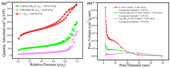 N2 adsorption–desorption isotherms (a) and pore size distribution diagrams (b) of C, C@Cd0.6Mn0.4S and Cd0.6Mn0.4S.