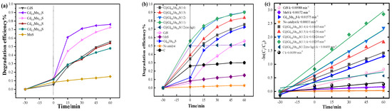 The photocatalytic degradation of tetracycline hydrochloride (TC) was carried out, catalyzed by the solid solutions CdxMn1−xS (x = 0, 0.2, 0.4, 0.6, 0.8, 1). Firstly, each solid solution of CdxMn1−xS (x = 0, 0.2, 0.4, 0.6, 0.8, 1) with a mass of 20 mg was put into 40 mL of TC aqueous solution (40 mg/L). After holding for 30 min under non-illumination conditions to reach the adsorption–desorption equilibrium, the reaction lasted for 60 min under visible light conditions, and the absorbance was measured every 15 min. The effects of different solid solutions of CdxMn1−xS (x = 0, 0.2, 0.4, 0.6, 0.8, 1) on the degradation efficiency of TC were different. The results are shown in Figure 6a. When the amount of Mn2+ was doped with an appropriate ratio of Mn2+ to Cd2+, the photocatalytic activity of the synthesized solid solution increased significantly. However, when the amount of the doped Mn2+ was too high, the photocatalytic activity decreased instead. When x = 1, CdxMn1−xS is CdS, and the catalytic activity of CdS decreased within the photoreaction process due to its susceptibility to photocorrosion. Cd0.8Mn0.2S and Cd0.6Mn0.4S were obtained after doping Mn2+ to CdS; their stability was significantly improved compared to CdS, and the catalytic effect was also significantly enhanced. However, because the absorbance of MnS to light is lower than that of CdS, with the increase in the doping amount of Mn2+, the photosensitivity of CdxMn1−xS significantly decreases, resulting in a reduction in photocatalytic activity. Therefore, considering the activity comprehensively, stability, and the degradation efficacy of the CdxMn1−xS photocatalysis, the degradation efficacy of Cd0.8Mn0.2S and Cd0.6Mn0.4S does not differ much with the extension of degradation time, and Cd0.8Mn0.2S has less Mn2+ doped, which cannot clearly explore the influence of Mn2+ doping on CdS. Therefore, Cd0.6Mn0.4S was selected as the optimized material for photocatalytic degradation of TC. The photodegradation efficiency of TC catalyzed by Cd0.6Mn0.4S was about 1.3 times that catalyzed by CdS.