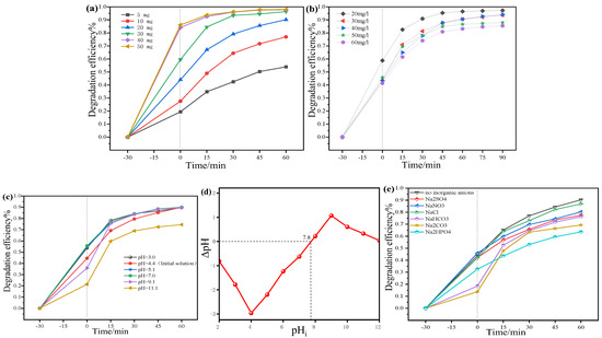 Effects of the dosage of C@Cd0.6Mn0.4S (a), the initial mass concentration of TC (b), the initial solution pH (c), the pHzpc of C@Cd0.6Mn0.4S (d), and inorganic anions and humic acids (e) on photocatalytic degradation of TC catalyzed by C@Cd0.6Mn0.4S (reaction conditions: C@Cd0.6Mn0.4S dosage of 20 mg, temperature of 30 °C, TC aqueous solution mass concentration of 40 mg/L and volume of 40 mL).