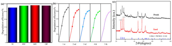 The photocatalytic degradation performance of C@Cd0.6Mn0.4S on the other antibiotics under the same conditions is shown in Figure 8a. As illustrated in Figure 8a, C@Cd0.6Mn0.4S has a good photocatalytic degradation efficacy not only on TC, but also on the other antibiotics such as oxytetracycline (OTC), levofloxacin (LEV), and ciprofloxacin (CIP). Their photocatalytic degradation efficiencies within 60 min are 90.21%, 95.09%, 96.19%, and 95.36%, respectively. To verify the reusability of C@Cd0.6Mn0.4S for photocatalytic degradation of TC, five cycling experiments were carried out on the photocatalytic degradation. The experimental conditions were 30 min of dark adsorption and 60 min of photocatalytic degradation. The results are shown in Figure 8b. After five cycling experiments, the photocatalytic degradation efficiency of TC by C@Cd0.6Mn0.4S gradually decreased from 90.05% to 79.23%. Comparing TC degradation efficiency by C@Cd0.6Mn0.4S with those by the reported photocatalysts, and the comparison results of TC photocatalytic degradation efficiency and the reaction conditions by C@Cd0.6Mn0.4S with those in the reported literatures by various photocatalysts, are shown in Table 1, and it is concluded that the photocatalytic degradation performance of C@Cd0.6Mn0.4S is comparable to those of the reported catalysts in the previous study in terms of the degradation efficiency of TC. In addition, the main reason for the decrease in photocatalytic efficiency observed in the reusability test is that the catalyst C@Cd0.6Mn0.4S experiences a slight mass loss in the process of recycling, and TC or its degradation intermediates would occupy little of the active sites of the catalyst. The XRD pattern of C@Cd0.6Mn0.4S before and after photocatalytic degradation of TC is shown in Figure 8c. Compared with the catalyst before the reaction, the main peaks of the catalyst after five reactions exhibit almost no change, except that XRD peaks of the used C@Cd0.6Mn0.4S sample narrowed, indicating that the crystal phase of C@Cd0.6Mn0.4S remained intact after the reaction, confirming that C@Cd0.6Mn0.4S has good stability. XRD peaks of the used C@Cd0.6Mn0.4S sample narrowed, which is supposedly evidence of recrystallization, which took place after the sample dried for 12 h at 70 °C.