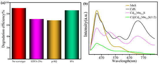 Effects of different quenchers on degradation efficiencies of TC (a) (Reaction conditions: C@Cd0.6Mn0.4S dosage of 20 mg, TC solution mass concentration of 40 mg/L, solution volume of 40 mL and temperature of 30 °C), and fluorescence intensity of the prepared material (b).