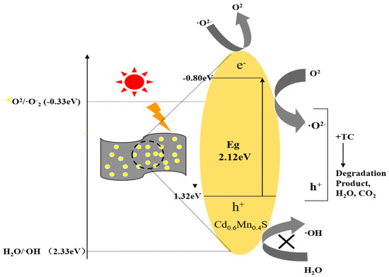 Under the irradiation of visible light whose energy is greater than or equal to the bandgap energy, C@Cd0.6Mn0.4S can generate photo-generated electrons (e−) and holes (h+), and electrons (e−) in the valence band (VB) will be excited and transited to the conduction band (CB). At the same time, holes (h+) are left on the VB as active species. Since Cd0.6Mn0.4S is loaded on biochar, more active sites are provided, which increases the contact chance between Cd0.6Mn0.4S and TC, and increases the exposure of the active sites of Cd0.6Mn0.4S, realizing the effective separation of electrons and holes, hindering the rapid recombination of photogenerated electrons and holes, and thereby improving the photocatalytic activity. Since the CB potential of Cd0.6Mn0.4S is more negative than that of E (O2/•O2− = −0.33 eV) [37,46,47], the electrons (e−) on CB of Cd0.6Mn0.4S will quickly migrate to the surface of biochar and react with O2 adsorbed on the active site to form •O2−, and then react with TC molecules to decompose into small molecules. With the continuous transfer of electrons, holes (h+) are left on VB of Cd0.6Mn0.4S. These remaining h+, due to their strong oxidation ability, will directly participate in the oxidation decomposing process of TC and play a major role in photocatalytic degradation. Eventually, TC is oxidized, degraded into small molecules, substances, and even into CO2 and H2O, etc. The mechanism is shown in Formulas (3)–(5).