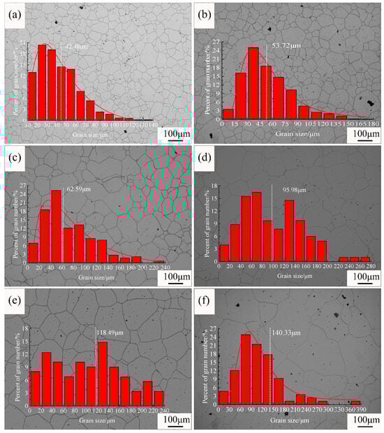 Morphology and grain size statistics of the original austenite grains after the temperature was held at 1150 °C for different durations: (a) 0 min, (b) 5 min, (c) 10 min, (d) 30 min, (e) 60 min, and (f) 90 min. (The grains began to grow significantly after the holding time started, and the size was significantly coarsened).