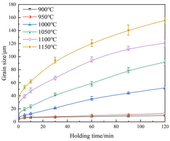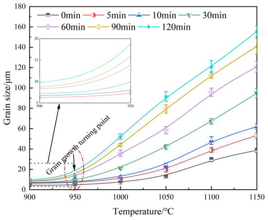 The grain growth behavior of steel was studied within the temperature range of 950–1150 °C and at holding times of 0–120 min. The main conclusions obtained are as follows: