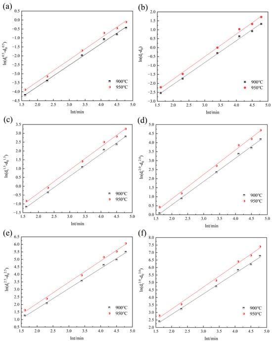 The relationship curves of and lnt at holding temperatures of 900–950 °C: (a) n = 0.5, (b) n = 1.0, (c) n = 1.5, (d) n = 2.0, (e) n = 2.5, and (f) n = 3.0.