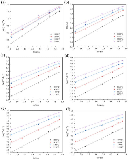 The relationship curves of and lnt at holding temperatures of 1000–1150 °C: (a) n = 0.5, (b) n = 1.0, (c) n = 1.5, (d) n = 2.0, (e) n = 2.5, and (f) n = 3.0.