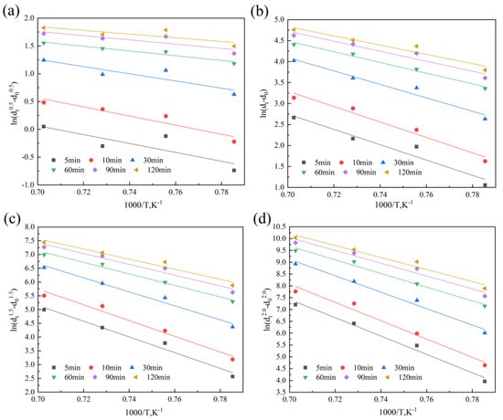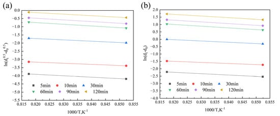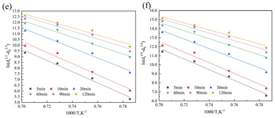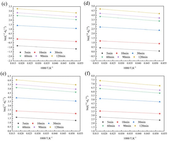 The relationship curves of and 1/T at holding temperatures of 1000–1150 °C: (a) n = 0.5, (b) n = 1.0, (c) n = 1.5, (d) n = 2.0, (e) n = 2.5, and (f) n = 3.0.