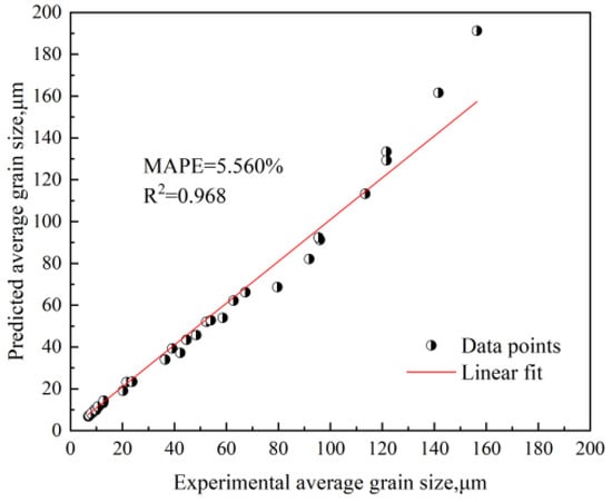 where Xi and Yi are the actual measured grain size and the grain size predicted by the equation, respectively; N is the total number of experimental samples; and is the average value of the actual measured grain size. Figure 14 provides a comparison chart of the actual measured grain size and the calculated value, where the two can be seen to match well, with an MAPE of 5.560% and an R2 = 0.968, indicating that the model can reasonably predict the grain growth of the experimental steel for different temperature intervals.