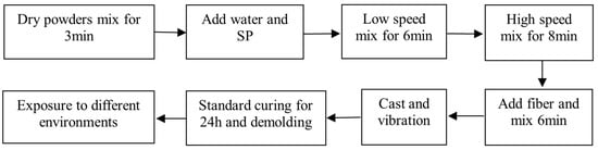 The specimen preparation procedure of UHPC is shown in Figure 1. During the mixing process, the dry powder, comprising PC, SF, BFS, and river sand, was initially blended together for 3 min using a mixer. Subsequently, water and SP were introduced and mixed for 6 min at low speed and 8 min at high speed. Following this, steel fibers were added by passing through a sieve with a 5 mm mesh size and mixed for an additional 6 min until uniform distribution was achieved. The fresh UHPC was then poured into molds and subjected to vibration to consolidate the mixture. The specimens were cured in a standard curing room within molds for 24 h, after which they were demolded. Prior to exposure to different environmental conditions, compressive strength, mass, and length of UHPC were measured. Subsequently, the specimens were placed and maintained in various environments until reaching the specified age, following which relevant performance tests were conducted.