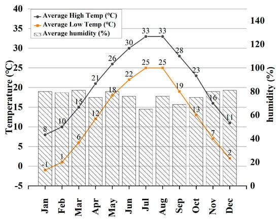 - Outdoors: Specimens were placed outdoors in Changsha at a 45° inclination facing south, experiencing natural weather conditions. During this period, the mean temperature and humidity in Changsha, China, are illustrated in Figure 2, fluctuating based on local weather conditions from an average temperature of −1 °C to 33 °C and relative humidity of 76% to 86%.