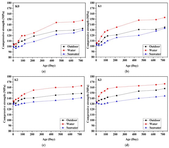Compressive strength of UHPC exposed to three different conditions. (a) K0; (b) K1; (c) K2; (d) K3.