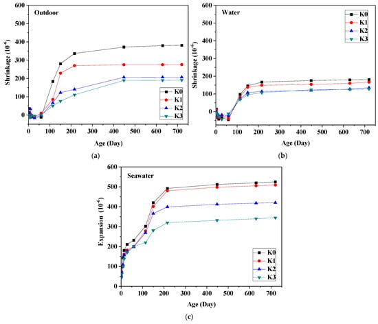 Length change of UHPC. (a) Outdoors; (b) water; (c) seawater.