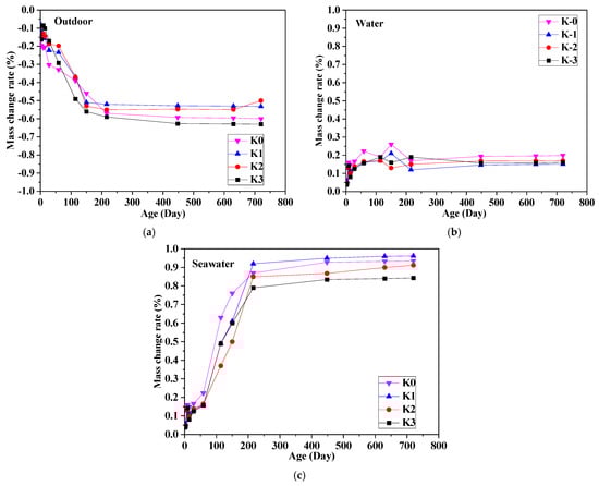 Mass change rate of UHPC. (a) Outdoors; (b) water; (c) seawater.