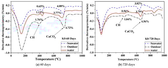 Figure 7 displays the DTG curve of UHPC exposure in various conditions for 60 and 720 days. From low to high temperatures, the endothermal peaks were observed within three distinct temperature ranges, corresponding to the dehydration of C-S-H, ettringite, and evaporable water, dehydroxylation of calcium hydroxide, and decomposition of calcium carbonate, respectively [42,43].