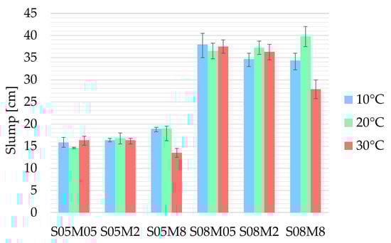 At 30 °C, the paste appears to be less workable for the 8 M concentrations than it is at a curing temperature of 20 °C, a phenomenon also observed in Portland cement (PC) studies [14]. Higher curing temperatures typically lead to the aggregation of cement, the merging of flocs, and the stiffening of the network [42,43], affecting the rheological properties of similar materials [44]. This process accelerates the reaction. In addition, Vázquez et al. [45] showed a decrease in the viscosity of the sodium hydroxide when the temperature is increased. In contrast, the S05M05 and S08M05 compositions seem more workable. However, considering the range of the results per composition (see Figure 1), it may be concluded that temperature does not significantly influence workability during the initial minutes after casting for the 0.5 M compositions. In fact, an average slump diameter across all three curing temperatures of 15.6 and 37.3 cm is obtained for S05M05 and S05M08, respectively. The maximum difference between the average slump and the slump obtained for each of the temperatures is at most 1 cm, which corresponds to the ±5 mm measuring error margin. During the first 10 min of age, the effects of temperature on the reaction are not pronounced [46], aligning with the timeframe in which the test is conducted. Furthermore, increasing the curing temperature enhances the effect of concentration at high S/B ratios, especially for S08M8.