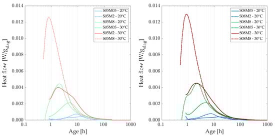 Heat flow of AAS compositions with S/B = 0.5 (left) and S/B = 0.8 (right), comparing curing temperatures of 20 and 30 C.