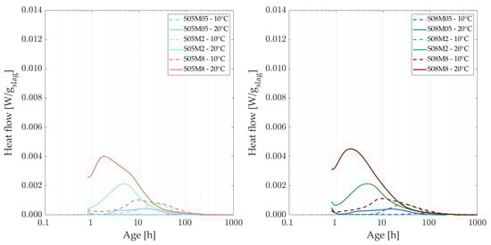 Heat flow of AAS compositions with S/B = 0.5 (left) and S/B = 0.8 (right), comparing curing temperatures of 10 and 20 C.