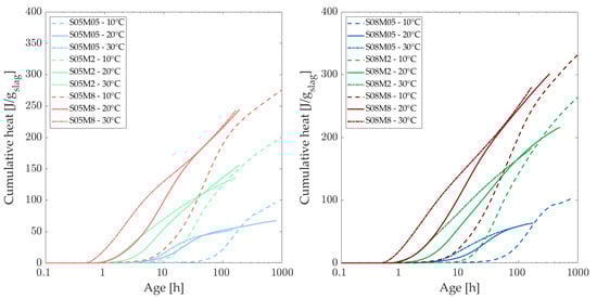 Cumulative heat of AAS compositions at different curing temperatures with S/B = 0.5 (left) and S/B = 0.8 (right).