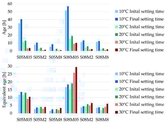 However, in terms of maturity, which relates to equivalent age and the apparent activation energy, the setting times generally appear to increase over time when the curing temperature increases. A relatively good correlation can be observed between the results at 10 °C and 20 °C with a maximum difference in (equivalent) age of 73% (S05M8) for the initial set (with an average of 30%) and a maximum difference of 22% (S08M2) for the final set (with an average difference of 10%). However, the results at 30 °C show significant deviation, with a maximum difference in (equivalent) age of 129% with respect to the results at 20 °C (S05M8) for the initial set (with an average of 56%) and a maximum difference of 82% (S08M8) for the final set (with an average difference of 32%). This discrepancy may be attributed to “time conversion” as well as to the increased apparent activation energy. For example, the setting times for the 2 M and 8 M samples are below 6 h at 20 °C and below 2 h and 30 min at 30 °C. Given that mixing and conducting the slump test require time, followed by the pouring of the Vicat tests, the entire process of sample placement also takes additional time. As a result, at 30 °C, the paste is mixed, adjusted, and modified for a longer proportion of the setting times compared to 20 °C or 10 °C. For instance, if the entire sample placement process takes 20 min, the extended time spent handling the mix at 30 °C (up to 47% of the setting time) represents a much larger proportion of the total setting time compared to 10 °C (up to 6% of the setting time). This increased manipulation may prevent the mix from properly initiating its setting process, explaining why the equivalent age setting times at 30 °C are higher, while those at 20 °C and 10 °C are more similar.