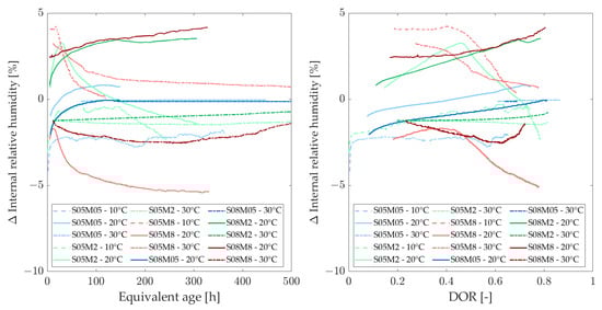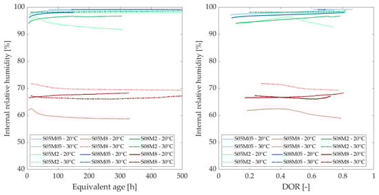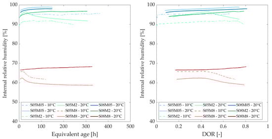Figure 6 and Figure 7 show the evolution of the internal relative humidity (IRH) of the AAS pastes at different curing temperatures, as a function of the equivalent age (left) and as a function of the degree of reaction (right).