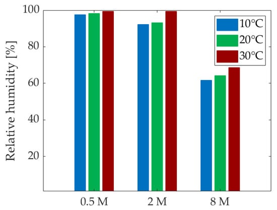 All graphs display three groups of curves corresponding to the activating solutions used in the compositions. The concentration of activating solution is the most significant factor influencing IRH, surpassing the effects of S/B and curing temperature. In addition, a higher drop is expected for compositions with lower S/B [52]. Initial observations suggest that higher molarity results in lower IRH values. Notably, the values obtained for the 8 M compositions do not fall within the same range as those for cement-based materials [6,18]. To better understand this phenomenon, the IRH of the solutions was measured. Additionally, since temperature appears to influence the range of IRH values, these effects will be analyzed.