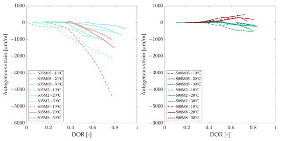 - Delsaute, B.; Staquet, S. Decoupling Thermal and Autogenous Strain of Concretes with Different Water/Cement Ratios During the Hardening Process. Adv. Civ. Eng. Mater. 2017, 6, 20160063. [Google Scholar] [CrossRef]