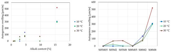 In conclusion, both internal (related to composition) and external factors (related to curing conditions) considerably affect the development of volume changes in cementitious materials [21]. Among these factors, the curing temperature is a major factor [6]. Therefore, tests have been conducted at 10 °C and 30 °C for this study, comparing the results to the established reference temperature of 20 °C studied by Lacante et al. [8]. The compositions under investigation consist of blast-furnace slag activated with 0.5, 2, and 8 M sodium hydroxide solutions with solution-to-binder ratios (S/B) of 0.5 and 0.8. This research addresses how varying curing temperatures influence key physical and chemical properties of alkali-activated slag (AAS) pastes, including autogenous strain, coefficient of thermal expansion, internal relative humidity, reaction kinetics, and workability. In summary, the aim and the novelty of this paper are to provide a comprehensive understanding of these effects and how curing temperature shapes the behavior of AAS pastes.
