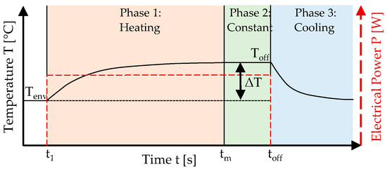 This indicates that at steady-state temperature, the supplied electrical power is equal to the energy loss, as calculated using Newton’s law of cooling. Therefore, Equation (5) can be transformed to evaluate the electrical power P(T), cf. Equation (6):