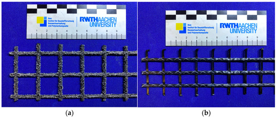 In this study, four combinations of carbon-textile-reinforced composites were examined, comprising two commercially available CTRs and two commercially available repair mortars, according to [30,31]. For the investigation, each of the two CTRs was combined with the two different repair mortars. The material properties of the CTRs are modified by the variations in the impregnation materials and geometrical configurations. Among the investigated CTRs, CTR-EP-Sand is impregnated with epoxy resin and further surface-modified through an additional coating of epoxy resin and quartz sand. CTR-EP-Sand is characterized by a roving axis distance of 21 mm and a uniform roving cross-section of 0.91 mm2 in both the warp and weft directions. Additionally, a CTR impregnated with polystyrene, designated as CTR-P, was analyzed. This textile contains a roving axis distance of 12/16 mm and a roving cross-section of 1.81 mm2 in both directions. The CTRs examined in this study are shown in Figure 3, with their material properties summarized in Table 1.