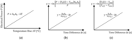 For Phase 3 (cooling), the material parameters are determined by transforming the cooling equation, cf. Equation (2), into a linear form. The resulting equation, shown in Equation (9) and illustrated in Figure 4c, defines a linear correlation with an intercept at the origin: