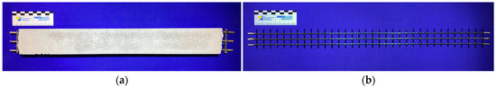 To determine the thermal behavior of electrically heated CTRC, rectangular CTRC specimens with integrated thermal elements were manufactured, as shown in Figure 5. The specimens measured 500 mm × 60 mm × 20 mm (L × W × H), with a constant mortar cover on both sides and a single layer of CTR. For this, CTR grids of three fiber strands in the warp direction were cut from larger textile-reinforcement grids. The CTRC specimens were hand-laminated using a solid-to-water weight ratio of 1:0.13 for both mortar materials. Subsequently, the fresh mortar properties were evaluated in accordance with [36,37,38]. Additionally, standard prism sets were produced to determine the flexural and compressive strengths corresponding to the respective thermal test date in accordance with [39].