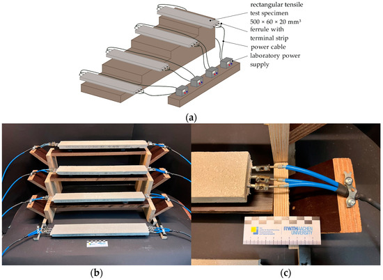 The specimens were demolded after one day, stored in water until the seventh day after production, and subsequently stored at a temperature of 20 ± 1 °C and a relative humidity of 55 ± 19% until testing at the age of 28 days after production. Prior to testing, the fiber strand ends were contacted using ferrules and terminal strips. For the CTR-EP-Sand specimens, the sand coating on the fiber strand ends was removed before establishing the electrical contact. On the day of testing, the specimens were connected to laboratory power supply, depicted in Figure 6. Four specimens were simultaneously tested within the test setup.
