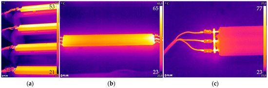 Example of heated CTRC: (a) thermal overview test setup; (b) CTRC-EP-M1 for ΔT = 27.5 °C; (c) connection detail—CTRC-EP-M1 for ΔT = 20 °C.