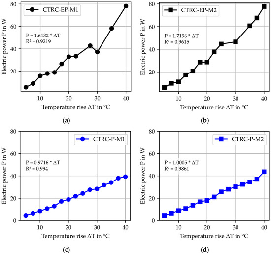 To visualize the temperature development as a function of electrical power and to determine hhAh as the slope for the material combinations based on Equation (7), the linear relationships of the investigated material combinations are depicted in Figure 8. A high coefficient of determination R2 validates the mathematical foundation described in Equation (7) and confirms the accuracy of the measurements without power consumption. The results of hhAh further highlighted the described differences between the CTRs. In Figure 8a,b, the coefficient of determination R2 of the linear function was lower for CTRC-EP compared to CTRC-P. Additionally, significant outliers were observed in the electric power used. The authors hypothesize that these differences in electrical resistance and the reduced coefficient of determination are related to the variations in the contact area of CTR. The epoxy resin coating, combined with additional sanding for CTR-EP-Sand, weakens the contact and the epoxy resin acts as an insulating layer. Outliers resulting from insufficient contact have been excluded from further analysis, cf. Table 4. Outliers are identified as experimental series in which the deviation between the electrical power derived from the applied voltage and current and the value calculated from the linear regression exceeds 16%.