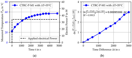 Example of heated CTRC-P-M1 with ΔT = 35 °C: (a) measured temperature with the applied electrical power; (b) linear correlation for determining the material-specific parameter hhAh/mhcp_h.
