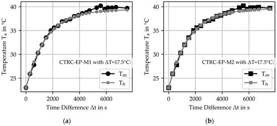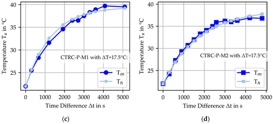 Using the determined parameters, the measured temperatures were compared with the calculated temperature profiles for each test. As an example, the temperature development for the material combinations with a temperature difference of ΔT = 17.5 °C is shown in Figure 10. The results indicate a high level of agreement between the calculated Th and measured Tm values, which confirms the applicability of the thermal model.