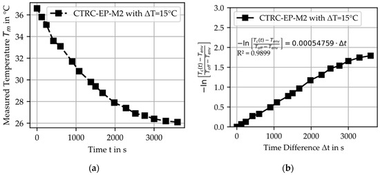 Example of heated CTRC-EP-M2 with ΔT = 15 °C: (a) measured temperature Tm; (b) linear correlation for determining the material-specific parameter hcAc/mccp_c.