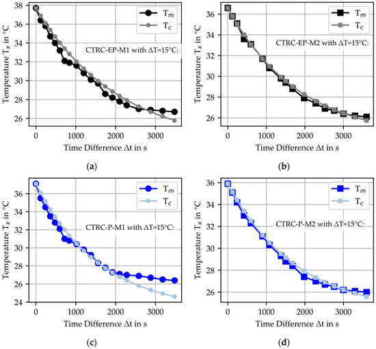 Comparison of calculated temperature Tc with the measured temperature Tm for cooling CTRC specimen with ΔT = 15 °C: (a) CTRC-EP-M1; (b) CTRC-EP-M2; (c) CTRC-P-M1; (d) CTRC-P-M2.