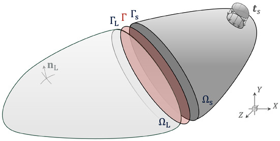 where , , and denote the density, acceleration field, Cauchy stress tensor and body forces. Deformation is described at time for a specified constant . Updated Lagrangian formulations of a single body are found in the following [32,33,34]; here, we extend this to a partitioned formulation to solve multiple solid subdomains.