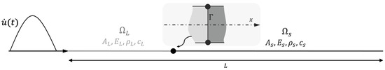We present a numerical example in 1-D, with the elastic wave propagation through a heterogeneous bar. Suppose the domain is split into two subdomains and of similar discretisation, with isotropic elastic properties of GPa, GPa and kgmm−3. These material properties result in a non-integer , where the time-step ratio is solely driven by the dissimilar material properties. Figure 2 depicts the bar configuration. The velocity boundary condition is applied to at with ms−1, where we define a half sine wave with a frequency of rads−1. The difference in material impedance results in a portion of the incident wave being transmitted and the remainder reflected in the opposite direction.